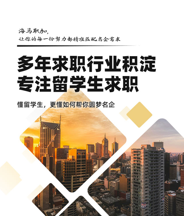 海马职加是海马中际集团High Mark® Group旗下行业出众的留学生求职品牌,服务覆盖英国、美国、澳大利亚、新加坡、加拿大、中国等国家。